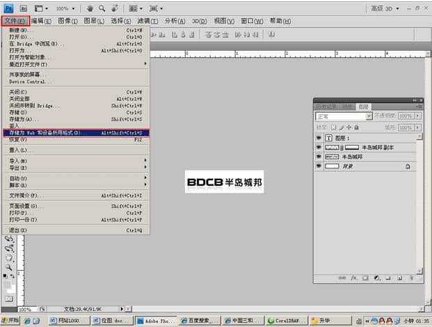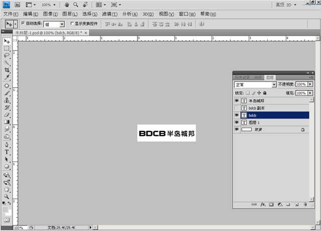 点击工具箱的 文字工具 在窗口空白处输入“BDCB 半岛城邦” (这里以公司名称首字拼音组合为一个LOGO设计模式)
