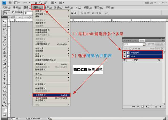 选好字体和颜色后进行图层合并(选择需要合并的图层,按shift先择连续多个图层,按住ctrl键选择多个不连续图层)再选择菜单图层/合并图层