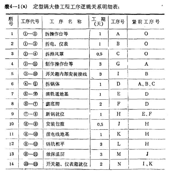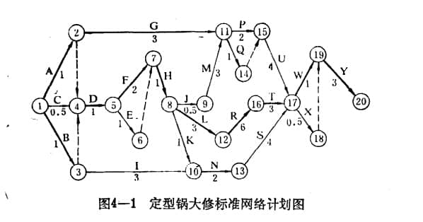 一切准备就绪后,即可编制网络规划,安排抢修进度。如果初步安排的结果不能保证在规定时间内完成抢修任务,则需要对关键路线进行分析研究,采取并行作业、完善劳动组织、缩短抢修停工时间等措施。在保证抢修人员满负荷的同时,还要保证抢修质量和抢修费用不超标。例如,京伦某厂的纺织定型锅大修项目,原计划保证只完成两台机器,大修时间为一个月。采用网络规划技术后,同时完成了三个整形锅的大修工程,大修周期缩短至21天,带来了显着的经济效益。并编制了八字锅检修标准网络规划图(详见图4-1)。八字锅检修项目逻辑关系明细表(详见表4-1(a))。