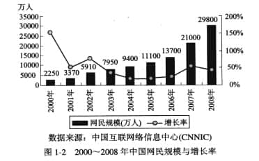 现在全世界有数亿用户连接到Internet。有专家预测,到2010年底,电子商务规模将达到5700亿,是2009年的两倍。另一个快速增长的电子商务网站发布平台——手机网也在快速发展。截至2009年6月末,中国手机网民规模已达1554亿。有业内人士预测,未来两年,中国使用手机的网民规模将超过3亿,庞大的用户群意味着无限的商机。图1-2 显示了2000 年至2008 年互联网用户的增长情况。
