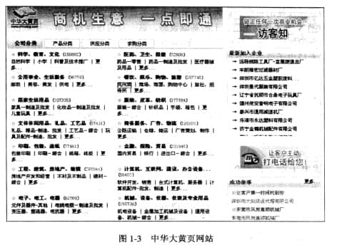 大家都知道,中国电信每年都会发布黄页广告,公布最新的业务信息。但企业信息在全年会因各种原因发生变化。这时利用互联网建立黄页广告可以更及时地提供企业的商业信息,随时提供最新的商业信息。图1-3是中国黄页网站截图。从图中可以看出,在网站黄页中查找商业信息显然更加方便,网上商业信息量之大是其他媒体无法替代的。