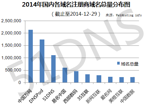 如图所示,2014年全年国内域名排名前十的依次为:中国万网、DNSPod、ynysys、一鸣中国、西部数据、35互联、新网互联、爱铭网、美程互联、中国数据。与2013年相比,仅有中国万网、爱铭网、美程互联网排名持平。其中,DNSPod和ynysys跻身前十,后来居上,分别排名第二和第三,可见域名增长势头强劲。受此影响,从中国更名为新网互联网开始,排名较2013年下降了两位。此外,中国数据连降三级,从第七位跌至榜单倒数第一。值得注意的是,友福网络和广州新世代黯然退出前十榜单。